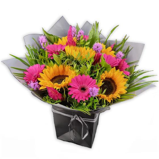 Golden sunflowers paired with vibrant pink gerberas, soft purple liatris and trailing greenery, bringing a tender, sunlit embrace to any room.