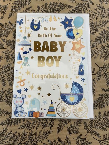 Gift card reading on the front: On the birth of your Baby Boy Congratulations. Inside it reads Having a new baby boy is simply wonderful! This comes with very best wishes for your lovely new baby boy and you. Congratulations!