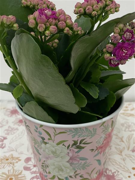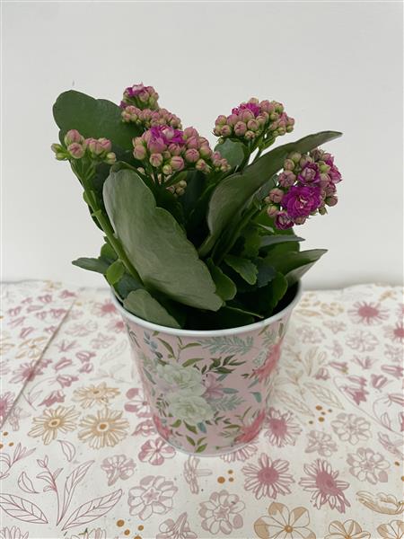 Cerise kalanchoe in pretty floral zinc pot