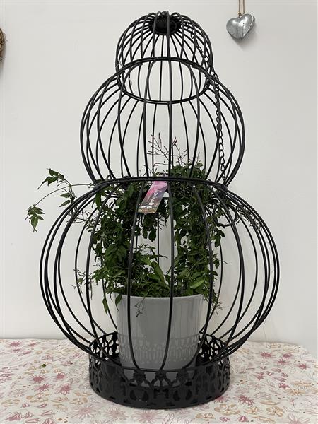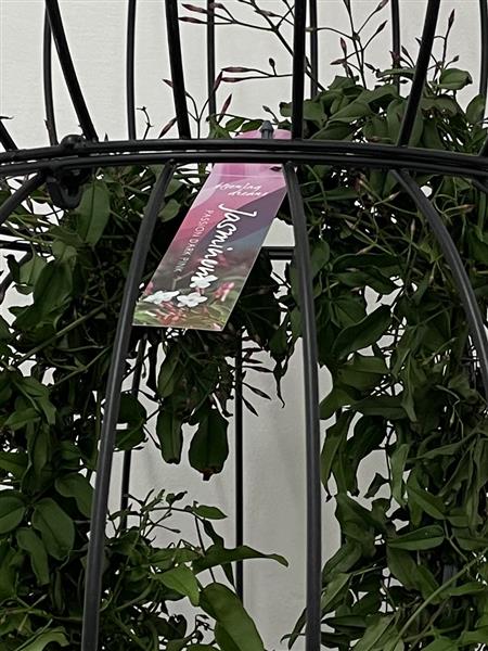 Pink flowering jasmine ideal for indoor or outdoor in summer months as it is not frost hardy. it is presented in a decorative black metal birdcage where once established it will grow up the sides.