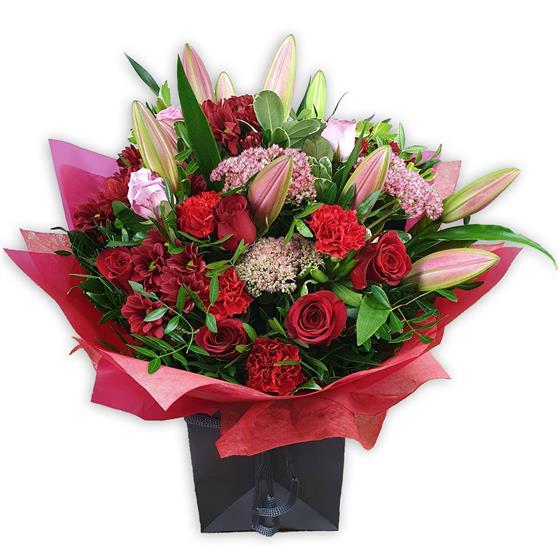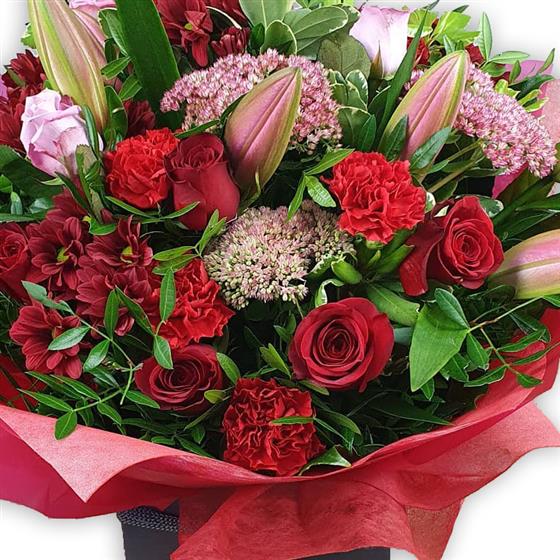Deep red roses, rich carnations and ruby chrysanthemums mingle with pale pink lilies and tender sedum blooms, all nestled in soft foliage for a warm, elegant expression of love.