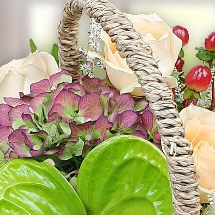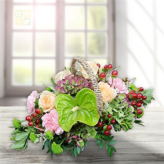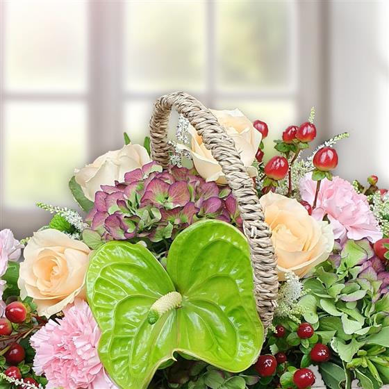 Delight in this cheerful basket of blush roses, pink carnations, hydrangea blooms, vibrant green anthurium, cherry-red hypericum berries and lush foliage, perfect for brightening any room with natural colour and joyful charm.