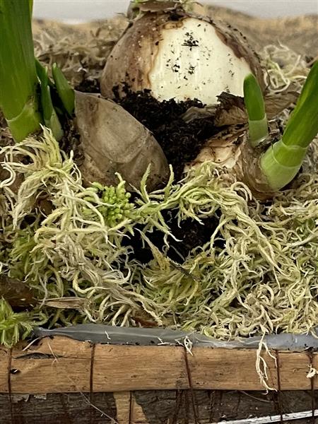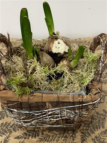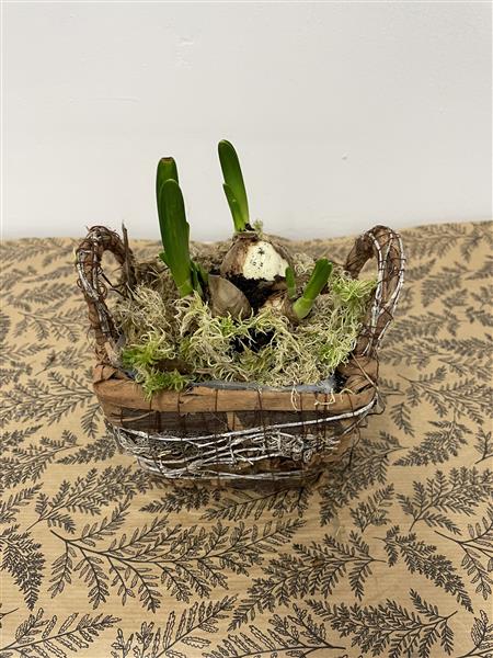Mini daffodil bulbs in rustic basket