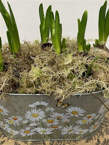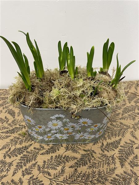 An arrangement of mini daffodils in a decorative zinc pot- can be indoor or outdoor