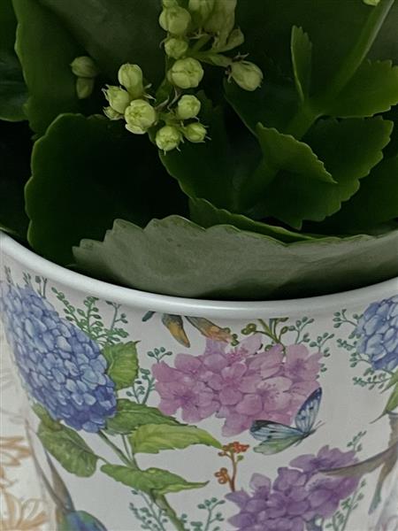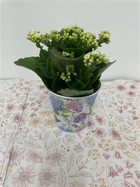 White kalanchoe in pretty floral pot